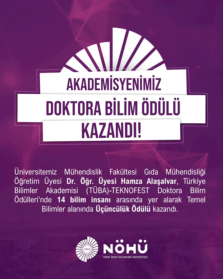 Niğde Ömer Halisdemir Üniversitesi Mühendislik Fakültesi Gıda Mühendisliği Bölümü öğretim üyesi Dr. Öğr. Üyesi Hamza Alaşalvar, Türkiye Bilimler Akademisi (TÜBA) ve TEKNOFEST iş birliğiyle düzenlenen “TÜBA-TEKNOFEST Doktora Bilim Ödülleri” kapsamında ödüle layık görülen 14 bilim insanı arasına girdi. Dr. Öğr. Üyesi Alaşalvar, Türkiye kaynaklı özgün doktora tezlerinin değerlendirildiği süreçte Temel Bilimler alanında Üçüncülük Ödülü’nü kazanarak üniversitemizin bilim dünyasındaki itibarını bir kez daha yükseltti.