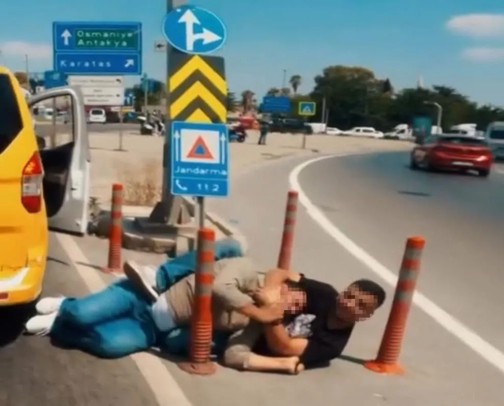 Bu ilginç kavga yoldan geçen motosikletlinin kask kamerasına yansıdı. Kavgayı ise taksici aracından inerek önledi.