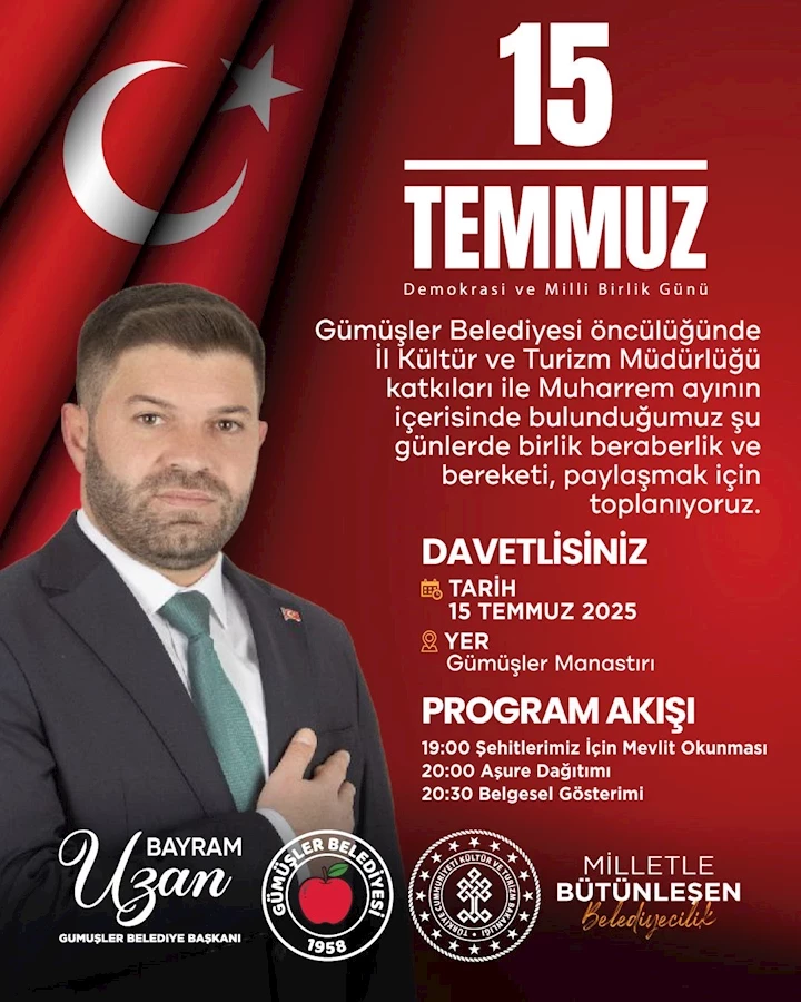 Tüm halkın davetli olduğu etkinlikle ilgili konuşan Gümüşler Belediye Başkanı Bayram Uzan, “15 Temmuz ruhunu yaşatmak, şehitlerimizi dualarla anmak ve birlik beraberliğimizi pekiştirmek için tüm hemşehrilerimizi bekliyoruz” dedi.