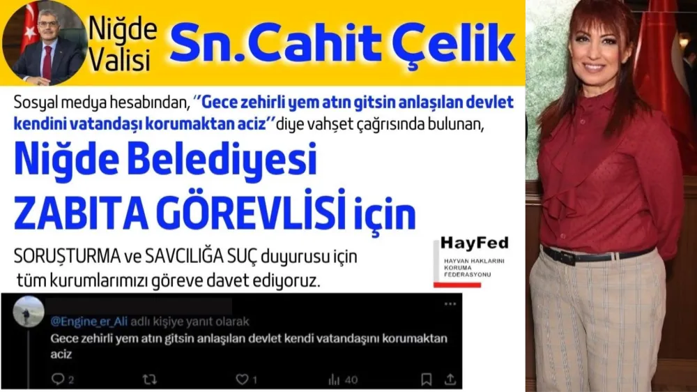 Hayvan Hakları Koruma Federasyonu (HAYFED) Başkanı Nihal Kasa tarafından yapılan açıklamada, “Niğde Valisi Sayın Cahit Çelik, sosyal medya hesabından “Gece ZEHİRLİ YEM ATIN gitsin anlaşılan devlet kendini vatandaşını korumaktan aciz” diye yazıp, vahşet çağrısında bulunan Niğde Belediye Zabıta Görevlisi için soruşturma ve savcılığa suç duyurusu için tüm kurumlarımızı göreve davet ediyor.