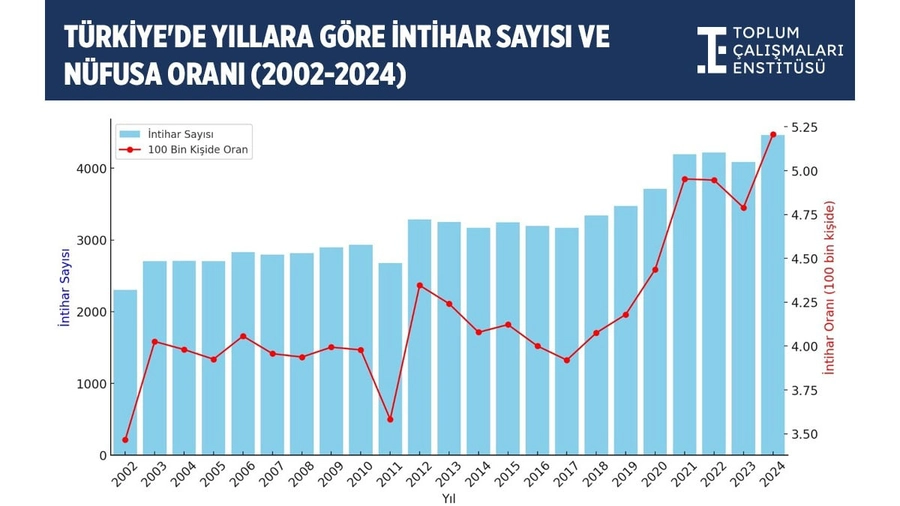 2002’de 2.301 olan intihar sayısı 2024’te 4.460’a ulaştı. Her 100 bin kişide görülen intihar oranı ise aynı dönemde 3,5’ten 5,2’ye yükseldi.