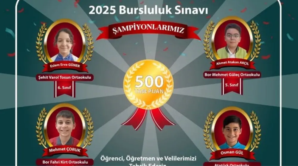 Tam puan alarak şampiyon olan Eslin Erva Güner - Şehit Varol Tosun Ortaokulu, Ahmet Atakan Akçıl - Bor Mehmet Güleç Ortaokulu, Mehmet Çoruk - Bor Fahri Kirt Ortaokulu ve Osman Gül - Atatürk Ortaokulu öğrencilerinin tebrik edildiği açıklamada; "2025 Bursluluk Sınavı’nda 500 tam puan alarak bizleri gururlandıran öğrencilerimizi, bu başarıda emeği geçen öğretmenlerimizi ve destek veren velilerimizi tebrik ediyoruz" ifadelerine yer verildi.