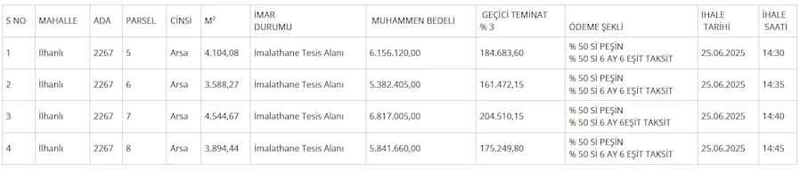 İhaleyi kazananlar, bedelin %50’sini peşin, kalan %50’sini ise 6 ayda 6 eşit taksit olarak ödeyebilecek.