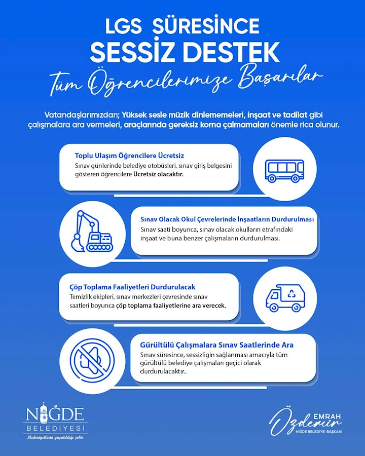 Niğde Belediyesi, 15 Haziran Pazar günü gerçekleştirilecek Liselere Geçiş Sistemi (LGS) sınavı süresince hem öğrencilerin konsantrasyonunu artırmak hem de sınav ortamının sağlıklı şekilde ilerlemesini sağlamak amacıyla sessizlik çağrısında bulundu.