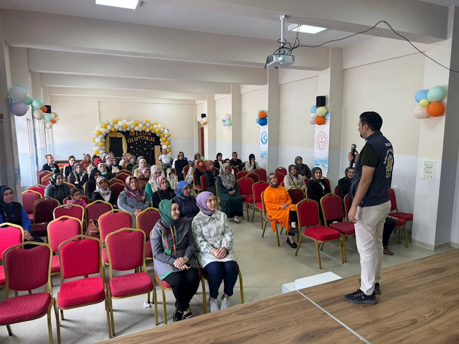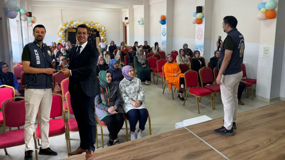 Halil Kitapçı Ortaokulu’nda 52 öğrenci velisinin katılımıyla düzenlenen etkinlikte; siber güvenlik, güvenli internet kullanımı, kişisel verilerin korunması, siber zorbalık, sosyal medyanın hayatımıza etkisi ve güçlü şifre oluşturma yöntemleri hakkında bilgilendirme yapıldı.