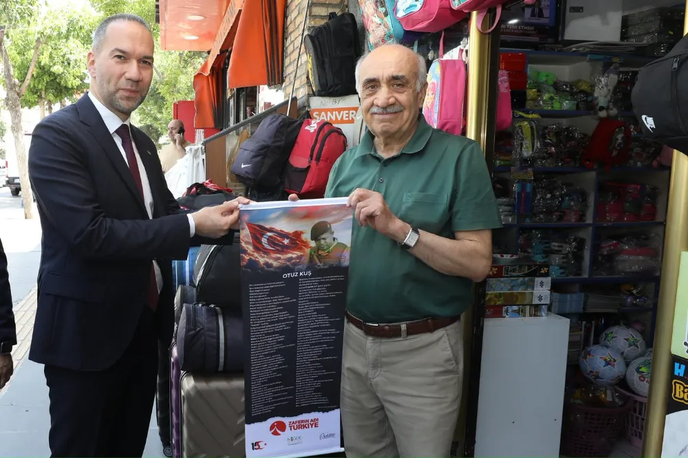 Demokrasi ve Millî Birlik Günü'müzün ruhunu her an kaplerinde yaşayan esnaflarımız dükkanlarının en güzel yerlerine assınlar diye #15Temmuz Şehidimiz, hemşehrimiz, kahramanımız Ömer Halisdemir ve tüm demokrasi şehitlerimiz için kaleme alınan “Otuz Kuş” şiirini hediye ettik” ifadelerini kullandı.