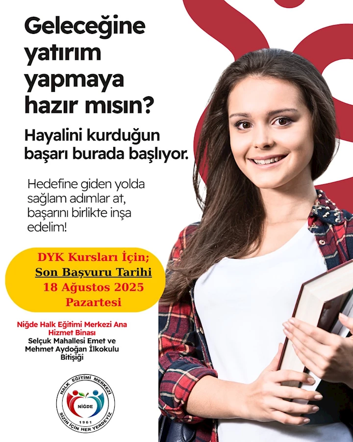 Başvurular, 18 Ağustos 2025 Pazartesi günü mesai bitimine kadar Niğde Halk Eğitimi Merkezi Ana Hizmet Binası’na şahsen yapılacak. Kontenjanların sınırlı olduğu duyurulan kurs için öğrencilerin başvurularını geciktirmemeleri önem taşıyor.