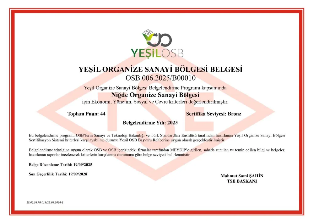 Türk Standardları Enstitüsü (TSE) tarafından gerçekleştirilen değerlendirme sonucunda 19 Eylül 2025 tarihinde onaylanan sertifika, OSB’nin enerji verimliliği, atık yönetimi, karbon ayak izinin azaltılması ve yeşil altyapı yatırımları gibi alanlarda attığı adımları resmiyete döktü.