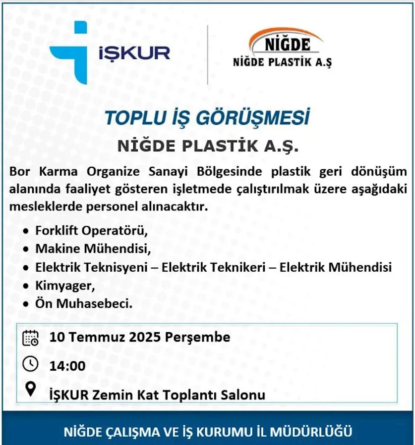 Bor Karma Organize Sanayi Bölgesi'nde plastik geri dönüşüm alanında faaliyet gösteren Niğde Plastik A.Ş., üretim kapasitesini artırmak ve büyüyen kadrosunu güçlendirmek amacıyla personel alımı gerçekleştirecek.