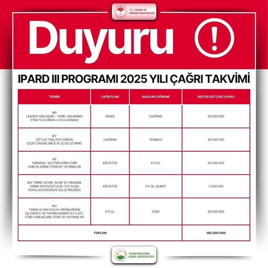 Niğde Valiliği yaptığı açıklamada TKDK tarafından açıklanan 2025 yılı IPARD III 6. Başvuru Çağrı Takvimi ve destek programları konusunda üreticileri bilgilendirdi.