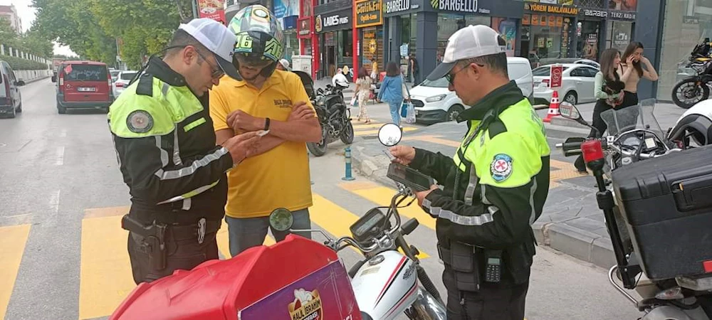 NİĞDE'DE MOTOSİKLET UYGULAMASI yaz mevsiminin gelmesiyle ve moto kurye Kerim artması ile birlikte Niğde trafiğinde motosiklet sayısı oldukça arttı. Niğde Emniyet Müdürlüğüne bağlı trafik ekipleri kentin muhtelif noktalarında motosikletlere yönelik uygulama yaptı. Uygulamada kasksız, tescilsiz ve yaya geçidini kullanan kuryelere ve motosiklet sürücülerine cezai işlem uygulandı.
