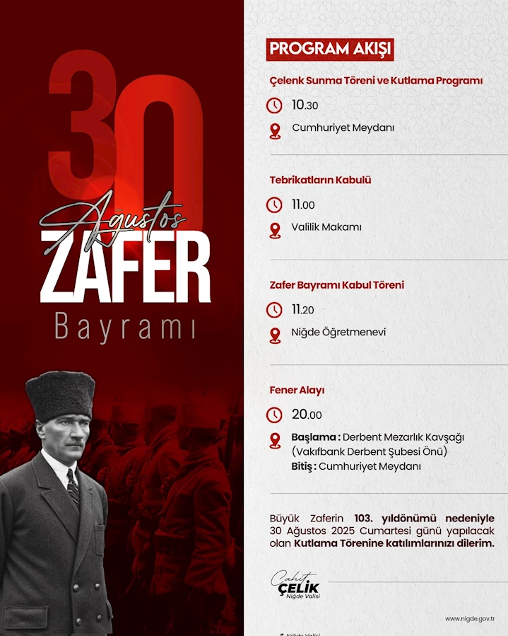 Program kapsamında sabah saat 10.30’da Cumhuriyet Meydanı’nda çelenk sunma töreni ve kutlama programı gerçekleştirilecek. Ardından saat 11.00’de Valilik makamında tebrikat kabulü yapılacak. Saat 11.20’de ise Niğde Öğretmenevi’nde Zafer Bayramı kabul töreni düzenlenecek.