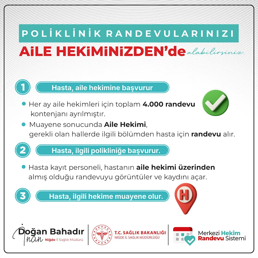 Niğde İl Sağlık Müdürlüğü, Merkezi Hekim Randevu Sistemi (MHRS) üzerinden randevu almakta zorlanan vatandaşlar için yeni bir kolaylık getirdi. Yeni uygulama kapsamında, aile hekimleri üzerinden hastane polikliniklerine doğrudan randevu alınabilecek.