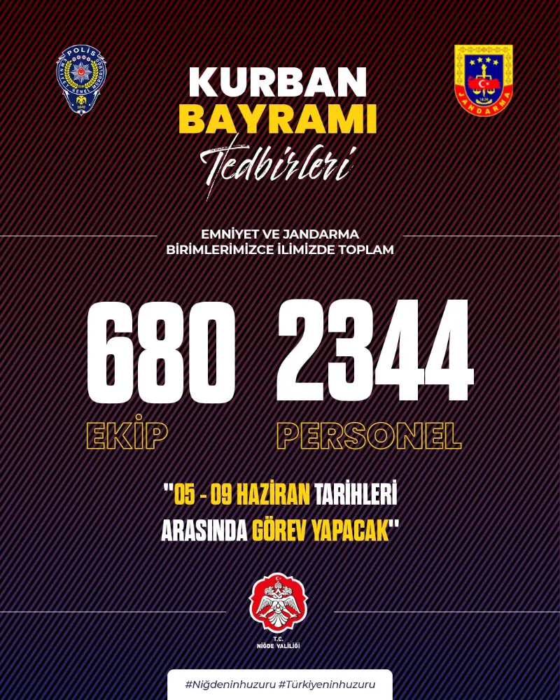 Niğde Valiliği koordinesinde yürütülecek çalışmalar kapsamında, 5-9 Haziran tarihleri arasında 680 ekipten oluşan 2 bin 344 personel sahada aktif olarak görev yapacak. Vatandaşların huzur ve güven içinde bir bayram geçirmesi için tüm birimler seferber edildi.