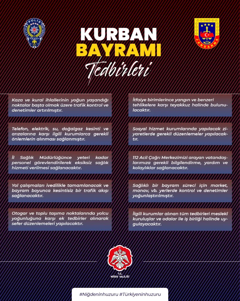 Niğde Valiliği tarafından yapılan açıklamada, alınan tüm önlemlerin vatandaşların huzur ve güvenliğini öncelediği belirtildi. Bayram süresince tüm kurumların koordinasyon içinde çalışacağı vurgulandı.