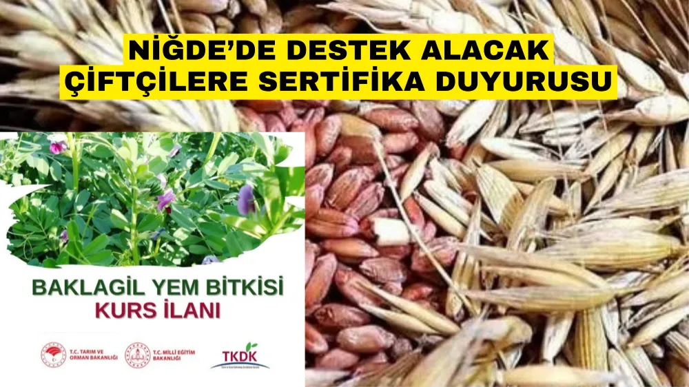 Niğde İl Tarım ve Orman Müdürlüğü tarafından yapılan duyuruda, “Tarım ve Kırsal Kalkınmayı Destekleme Kurumu (TKDK) tarafından yem bitkileri ekilişi destek kapsamına alınmıştır. Destekten faydalanacak olan çiftçilerimizin ilgili alanda diploması veya 1(Bir) yıllık tecrübesini gösterir ÇKS belgesi ya da ilgili alanda sertifikası bulunması zorunludur.