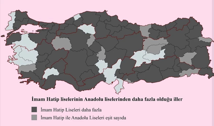 Harita, sadece sınavla öğrenci alan okulları baz alarak hazırlanmış ve koyu gri ile belirtilen illerde İmam Hatip liseleri sayıca daha fazla olurken, açık griyle gösterilen illerde Anadolu ve İmam Hatip liselerinin sayısı eşit.
