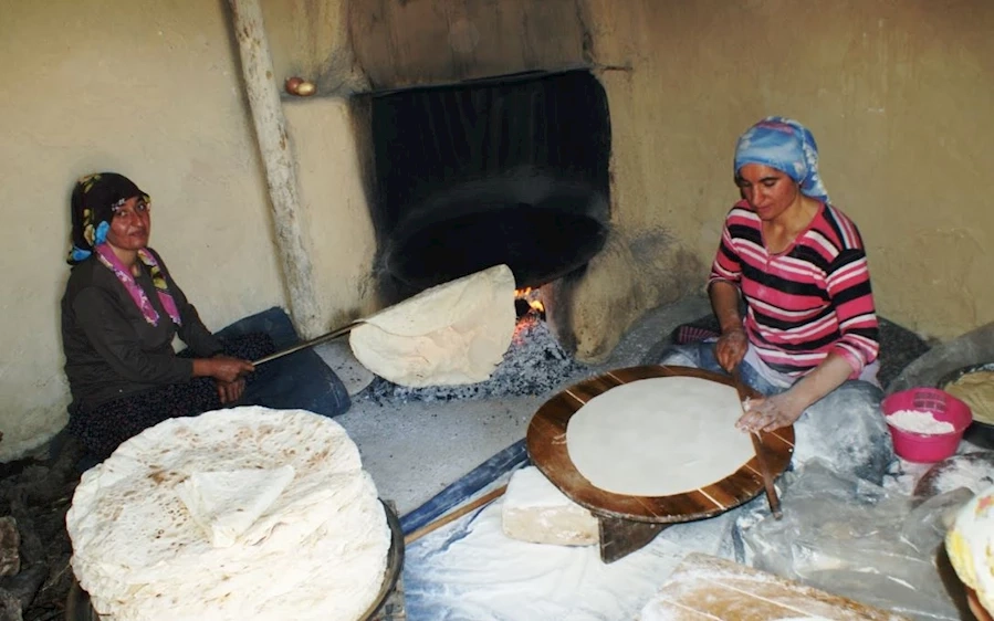 Sabahın ilk ışıklarında bir araya gelen kadınlar, hava kararıncaya kadar imece usulü yufka yapımına devam ediyor. Un, tuz ve suyla hazırlanan hamurlar, tecrübeli ellerde bezeler haline getiriliyor. Bezeler daha sonra oklavalarla incecik açılıyor ve ateş üzerindeki sacda pişirilerek yufka ekmeğe dönüştürülüyor.