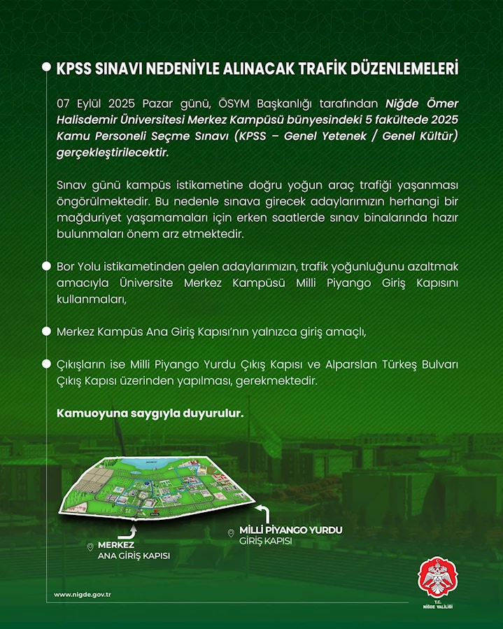 Trafik düzenine ilişkin de bilgilendirmede bulunuldu. Buna göre, kampüse Bor yolu istikametinden gelecek adayların Milli Piyango Yurdu Giriş Kapısı’nı kullanmaları gerekiyor. Merkez Kampüs Ana Giriş Kapısı ise yalnızca giriş amaçlı olacak. Çıkışların ise Milli Piyango Yurdu Çıkış Kapısı ve Alparslan Türkeş Bulvarı Çıkış Kapısı üzerinden yapılacağı duyuruldu.