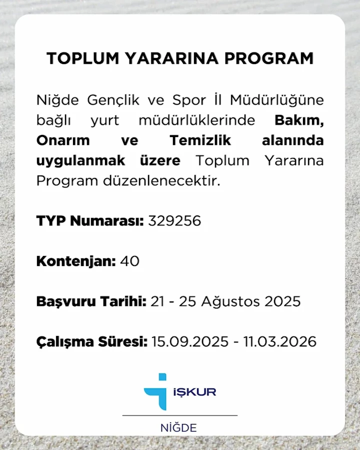 Niğde Gençlik ve Spor İl Müdürlüğü bünyesinde, yurt müdürlüklerinde bakım, onarım ve temizlik alanlarında istihdam edilmek üzere Toplum Yararına Program (TYP) kapsamında personel alımı yapılacak.