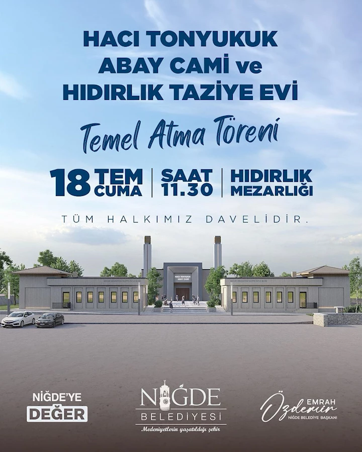 Niğde Belediyesi tarafından yapılan duyuruda, Hacı Tonyukuk Abay Cami ve Hıdırlık Teziye Evi projesinin temel atma töreninin 18 Temmuz 2025 Cuma günü Saat:11:30'da Hıdırlık Mezarlığı'nda yapılacağı belirtildi. Yapılacak olan temel atma törenine tüm Niğde halkı davet edildi.