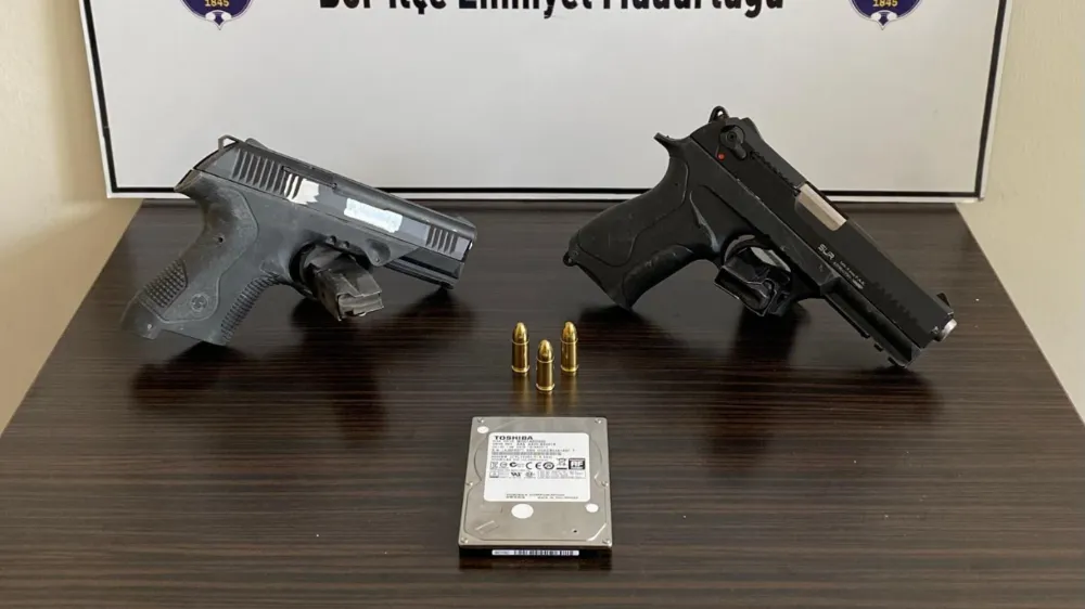Şüphelilerin ikamet, işyeri ve araçlarında yapılan aramalarda 1 adet 9 mm ruhsatsız tabanca ve şarjörü, 1 adet kurusıkı tabanca, 3 adet 9 mm tabanca fişeği ve 1 adet kamera kayıt cihazına takılı harddisk ele geçirildi.
