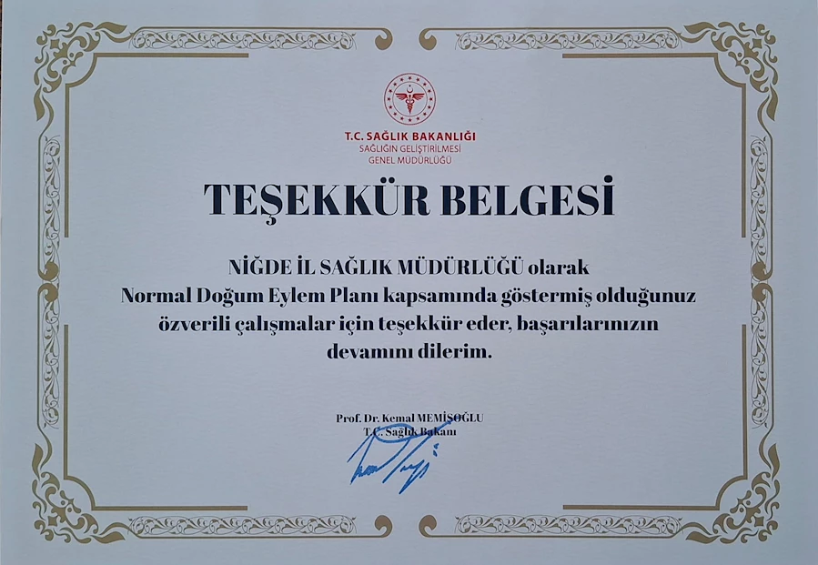 Sağlık Bakanlığı tarafından Türkiye genelinde başlatılan “Normal Doğum Eylem Planı” kapsamında yürütülen başarılı çalışmalar nedeniyle Niğde İl Sağlık Müdürlüğü, Sağlık Bakanı Prof. Dr. Kemal Memişoğlu tarafından teşekkür belgesi ile onurlandırıldı.