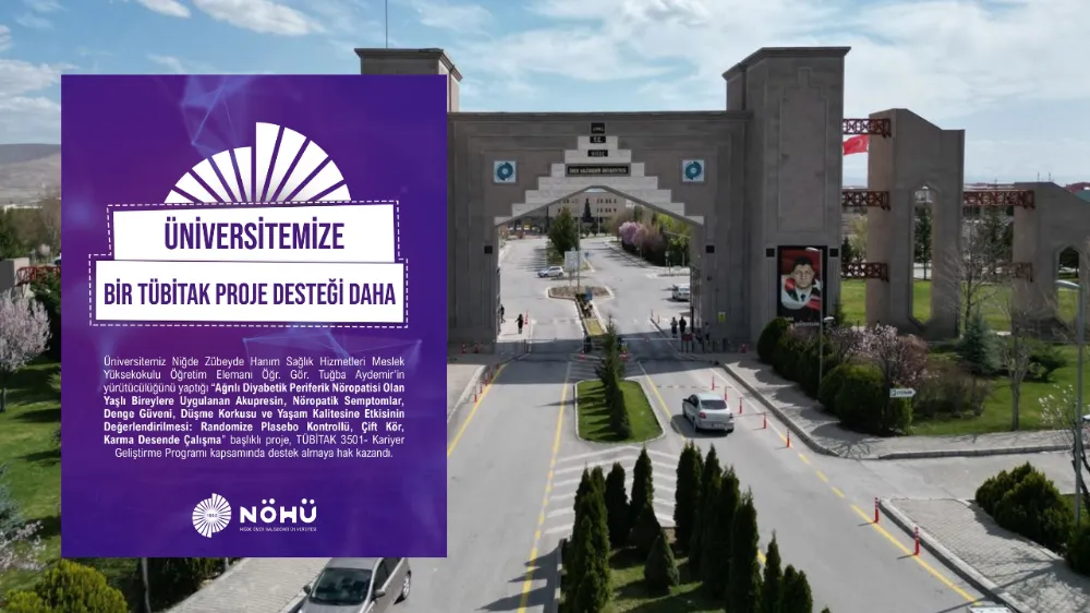 Niğde Ömer Halisdemir Üniversitesi Zübeyde Hanım Sağlık Hizmetleri Meslek Yüksekokulu Öğretim Elemanı Öğr. Gör. Tuğba Aydemir’in yürütücülüğünü yaptığı “Ağrılı Diyabetik Periferik Nöropatisi Olan Yaşlı Bireylere Uygulanan Akupresin, Nöropatik Semptomlar, Denge Güveni, Düşme Korkusu ve Yaşam Kalitesine Etkisinin Değerlendirilmesi: Randomize Plasebo Kontrollü, Çift Kör, Karma Desende Çalışma” başlıklı proje, TÜBİTAK 3501- Kariyer Geliştirme Programı kapsamında destek almaya hak kazandı.