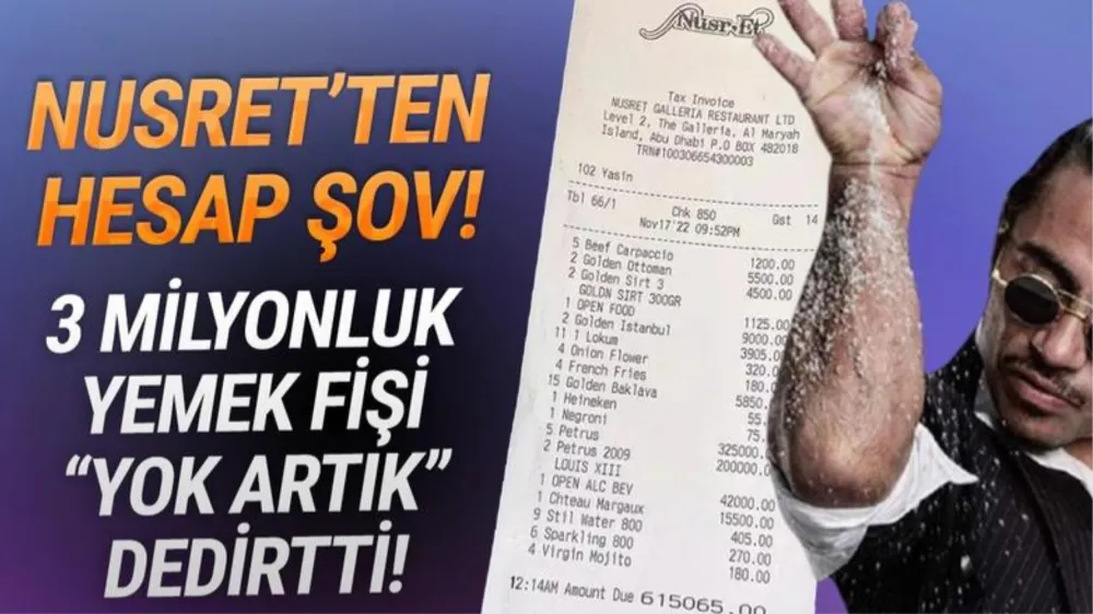 Ünlü kasap ve işletmeci Nusret Gökçe, Dubai'deki restoranında 108 bin dolar (yaklaşık 3 milyon TL) tutarında bir hesap ödediğini sosyal medyada paylaştı.