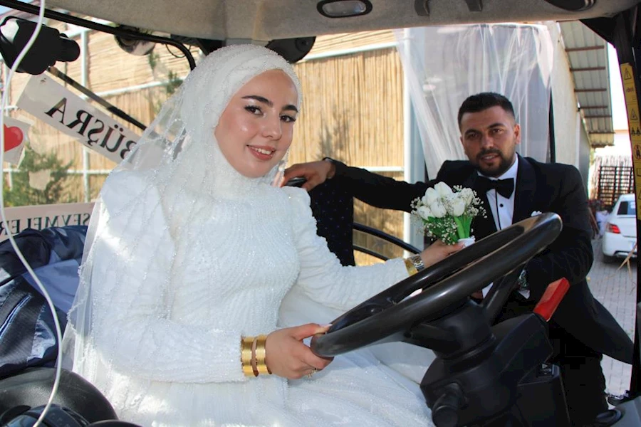 Çocukluğu tarlalarda geçtiği için 18 yaşına girer girmez tutkunu olduğu traktörün sürücü belgesini alan gelin Büşra Yaman, gelin arabası olarak da traktörünü seçti. Süslenen traktörünün direksiyonuna gelinliğiyle geçip eşini yanına bindiren gelin, en mutlu gününü doyasıya kutladı.