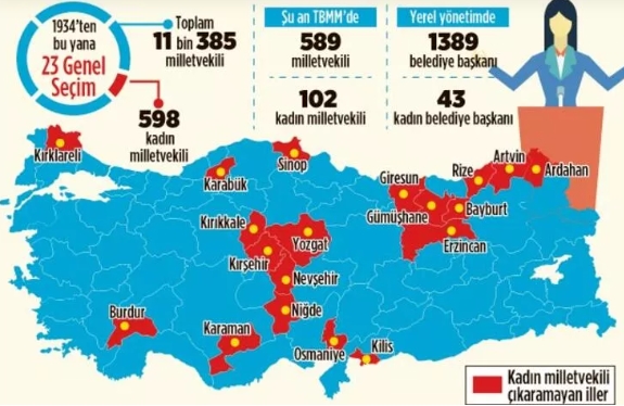 Türkiye Cumhuriyet tarihi boyunca bir tane bile kadın milletvekili çıkarmamış tam 20 şehre sahip. O şehirler; Adıyaman, Ardahan, Artvin, Bayburt, Burdur, Erzincan, Giresun, Gümüşhane, Karabük, Karaman, Kilis, Kırıkkale, Kırklareli, Kırşehir, Nevşehir, Niğde, Osmaniye, Rize, Sinop ve Yozgat. Özellikle bu illerde gözler önümüzde ki aylarda yapılacak seçime çevrildi. Kafalarda bu iller kadın vekil çıkartacak mı? sorusunda.