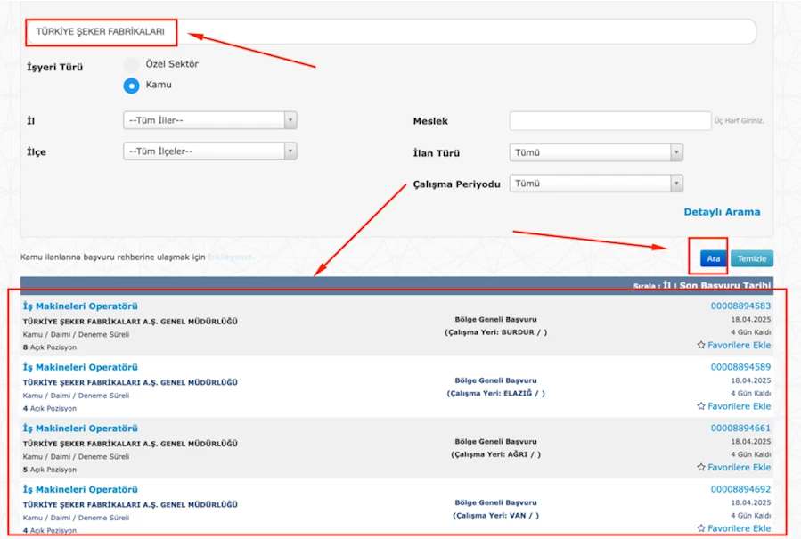 2.ADIM: Sisteme giriş yaptıktan sonra yukarıda belirtilen ” Aradığınız pozisyon, meslek, nitelik, beceri, firma adını yazınız.. ” şeklindeki kutuya ” TÜRKİYE ŞEKER FABRİKALARI ” yazarak ” ara ” butonuna tıkladıktan sonra ilgili ilanlara ulaşabileceksiniz.