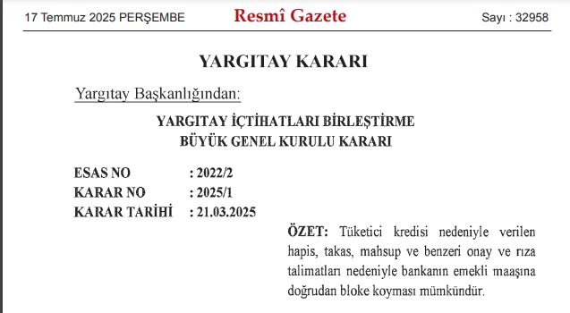 Yargıtay’ın içtihat birleştirme kararında, tüketici kredisi borçları nedeniyle borçlunun bankaya verdiği “hapis, takas, mahsup ve benzeri onay ve rıza talimatlarının” geçerli olduğu ve bu doğrultuda emekli maaşlarına bloke uygulanabileceği belirtildi.