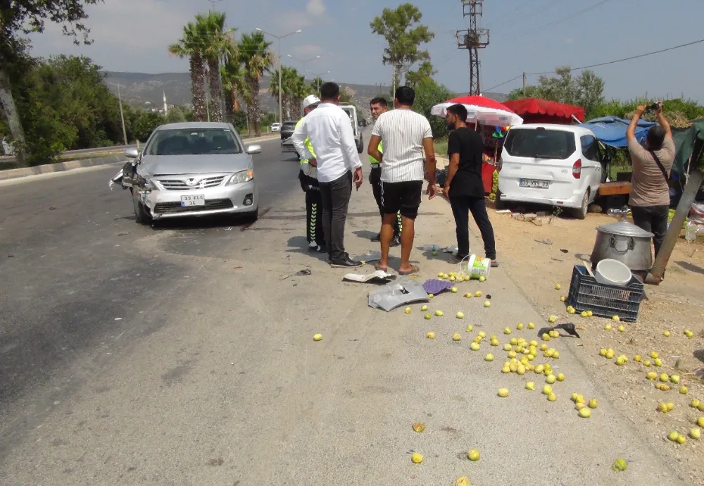 Kazaya karışan araçlardan biri çilek ve incir gibi yöresel ürünler satılan tezgaha girdi.